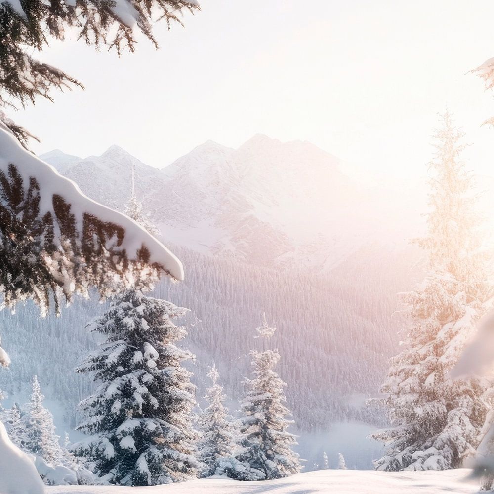 A magical winter wonderland unfolds in the soft light of the morning sun. The glistening blanket of snow sparkles like thousands of diamonds, while majestic fir trees wrapped in festive white embrace the landscape. Gentle hills and distant mountains form the perfect backdrop for this peaceful, wintry idyll that invites you to dream and linger.