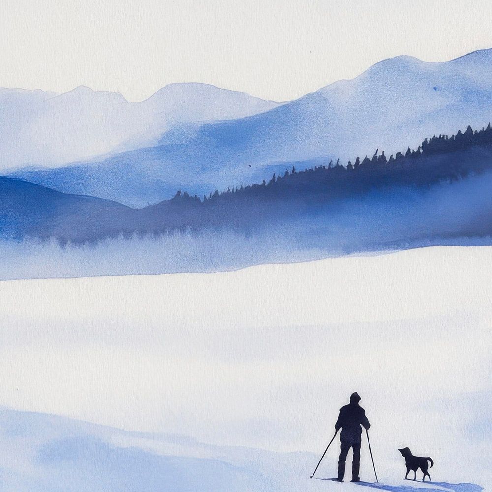 A man and a dog stand on untouched snow in a tranquil winter landscape, suffused with soft shades of blue. The majestic mountains in the background seem to disappear in the mist, while the holistic scene radiates a peaceful harmony. The minimalist contours emphasise the vastness and tranquillity of this wintry idyll.