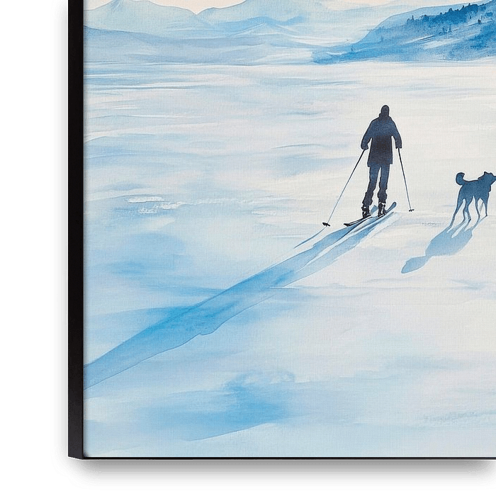 In a dreamlike winter landscape, a skier and his faithful dog make their way through untouched snow. The soft colours of the sky merge with the glistening white of the surface, while the elongated shadows of the two figures create a harmonious connection to nature. An image of freedom and friendship in an infinite expanse.
