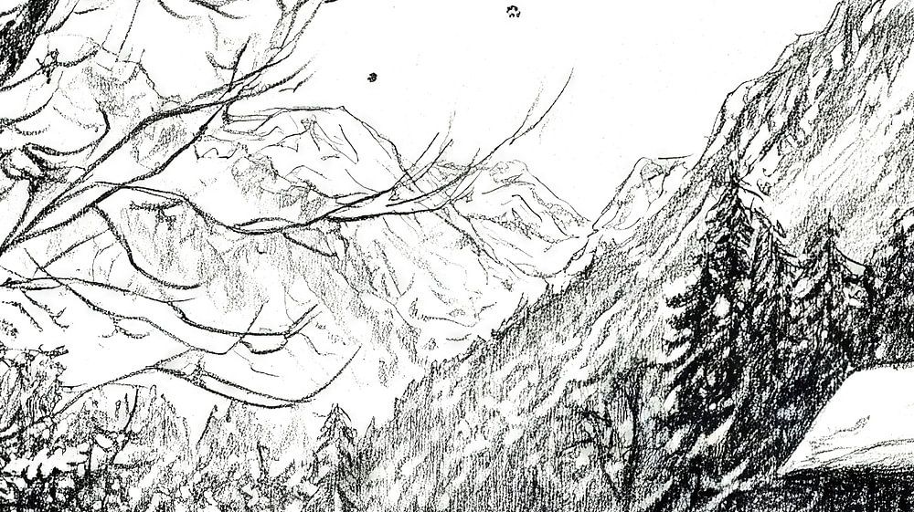 Soft snow falls on a small, cosy wooden hut nestled in a remote mountain forest on the edge of a frozen lake. The tranquil setting exudes a peaceful winter atmosphere, while the surrounding trees and frozen water are covered in a thick layer of snow. The clear winter sky and the snow-covered mountains in the background reinforce the feeling of solitude and closeness to nature in this idyllic winter landscape.