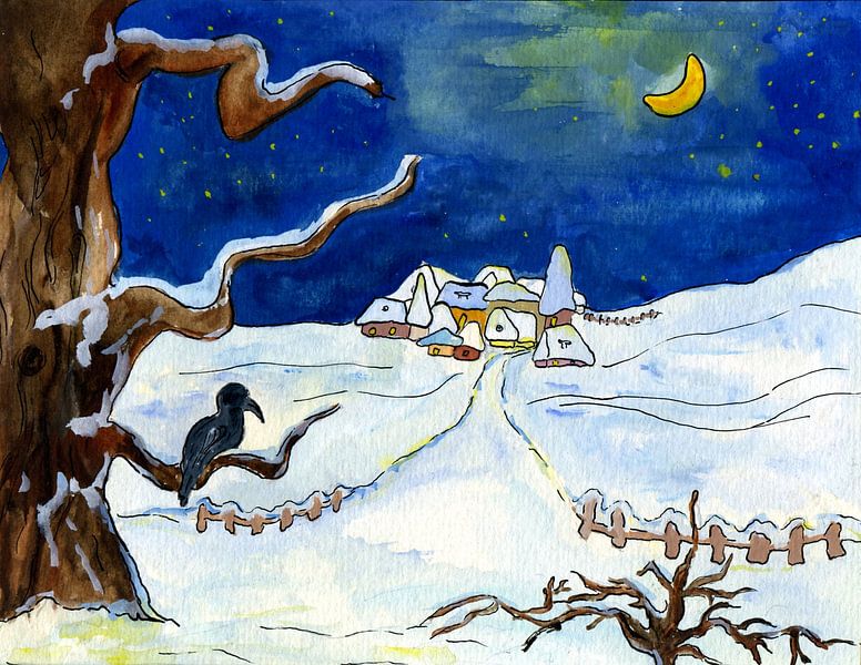 A snow-covered winter landscape at night...a raven looks dreamily at the sleepy snow-covered houses and the moon shines brightly.
