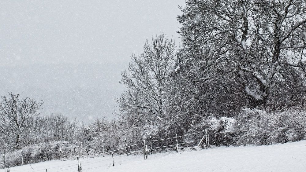 The meadows and trees around Wijlre in southern Limburg provided with a fresh layer of snow provide a minimalist winter scene (Heuvelland, Netherlands).