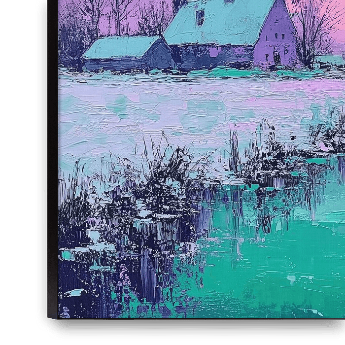Winter landschap | Neon Huis - Dit schilderij opent met een stilte die bijna hoorbaar wordt — een kleine boerderij met een besneeuwd dak nestelt zich links van het midden, en het grootste verhaal speelt zich af op het water en in de lucht. De kunstenaar koos bewust voor een onalledaagse kleurenkeuze: een zwoele, neon-achtige roze rand langs de horizon loopt over in mintgroene en turquoise vlakken die de gracht terugkaatsen. Het resultaat is een winter landschap schilderij waarin het gewone huis plotseling een anker wordt in een bijna droomachtige spiegeling. Je voelt hoe de lucht en het water elkaar vasthouden; de spiegeling werkt als een zachte herhaling van de hemel, maar met randen en barsten door penseel en paletmes.