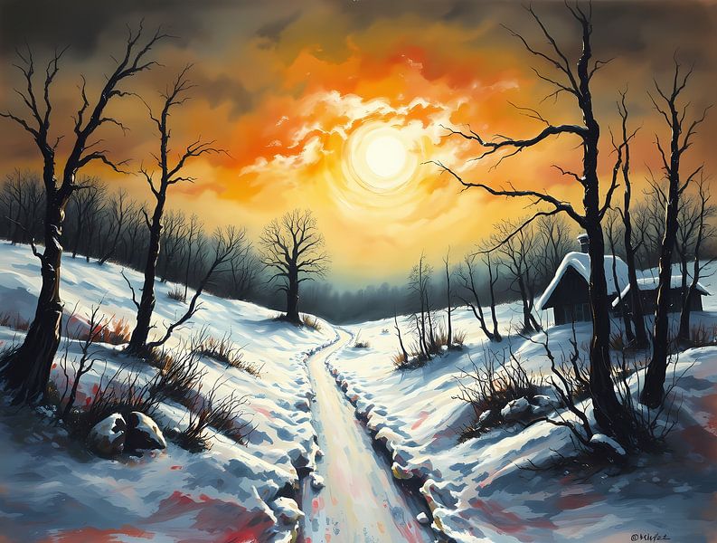 Buy this landscape artwork Winter landscape sunset by Linda de Klein on canvas, ArtFrame, poster and wallpaper, printed on demand in high quality.