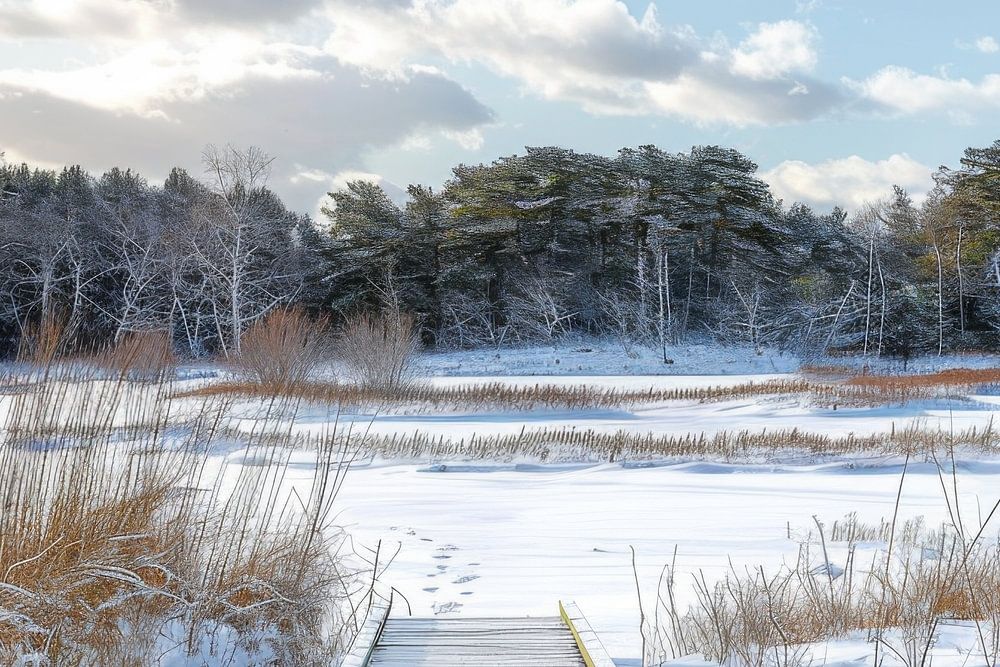 Immerse yourself in the tranquil and peaceful atmosphere of a snowy winter landscape through this artistically designed window picture. The snow-covered footbridge leading to a frozen lake creates an image of calm and serenity. Ideal for lovers of nature motifs and minimalist art who want to bring the splendour of winter into their home.