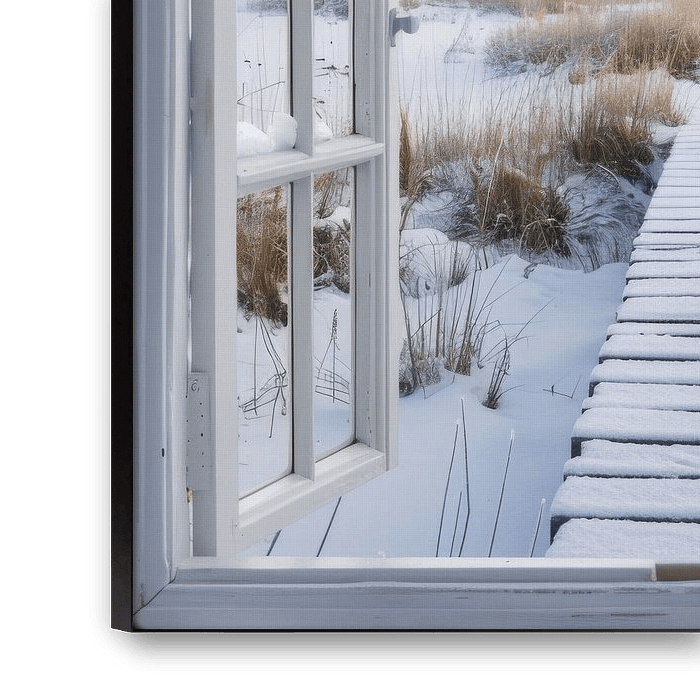 Immerse yourself in the peaceful beauty of a snowy winter landscape, captured through an open window. The pristine blanket of snow and clear blue sky create a calming atmosphere perfect for any room. Ideal for lovers of nature and winter, this scene will bring a refreshing and contemplative mood to your living room, bedroom or office. Perfect for winter decorating, this picture creates a calm and serene atmosphere.