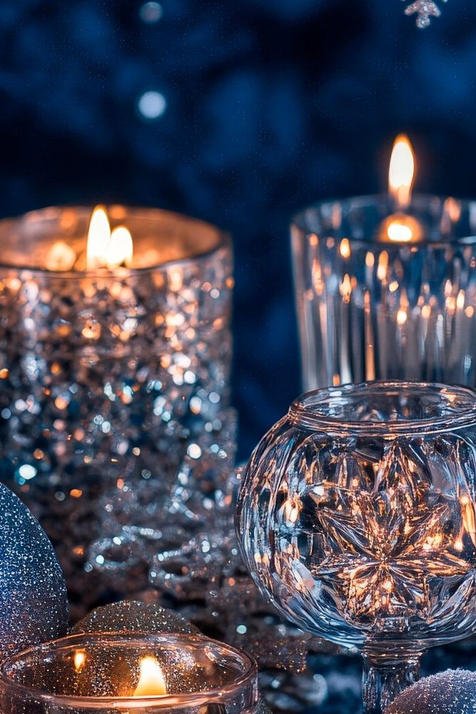 Sparkling candles and glittering Christmas baubles glow in a magical winter landscape, creating an atmosphere of warmth and cosiness. The gentle contrast between the glowing flames and the cool, shimmering snowflakes creates a festive ambience. This atmospheric arrangement is perfect for the living room to celebrate contemplative moments during the festive season.