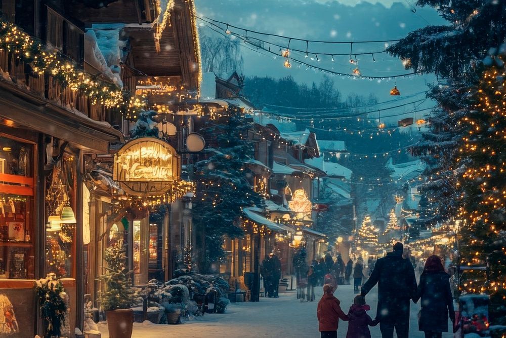 A festively decorated street shines in a magical winter landscape, enveloped in soft snowflakes. Lights twinkle on the houses and a Christmas tree is surrounded by cheerful people. This atmospheric scene brings warmth to every living room and invites you to dream. Perfect for cosy evenings in the cold season.