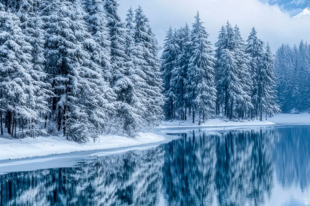 In the midst of a frosty winter landscape, majestic snow-covered mountains rise up, their peaks disappearing into the clouds. The crystal-clear lake rests quietly, a reflection of the surrounding conifers, which impressively display their winter garments. A calm, almost magical atmosphere pervades the scenery - the perfect harmony of nature and silence.