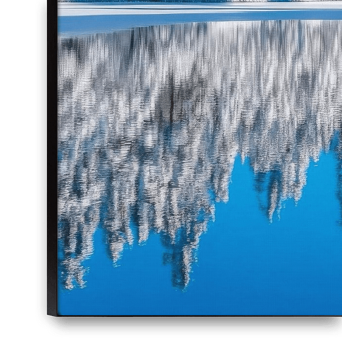 In a surreal winter paradise, the snow-capped mountain shines majestically in the azure sky. The smooth surface of the water perfectly reflects the frosty splendour, while snow-covered trees line the banks. Every breath brings the fresh cold of nature, which blends harmoniously with the stillness of winter. A place of shimmering beauty…