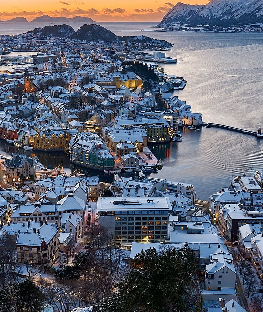 About "Winter scenery over Ålesund from Fjellstua during sunset, Norway"
