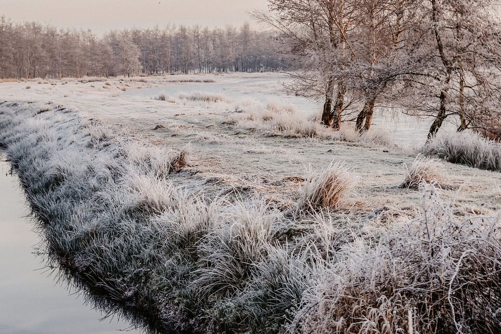 A very early winter morning in December. Due to the freezing weather a beautiful white landscape with a beautiful sunrise.