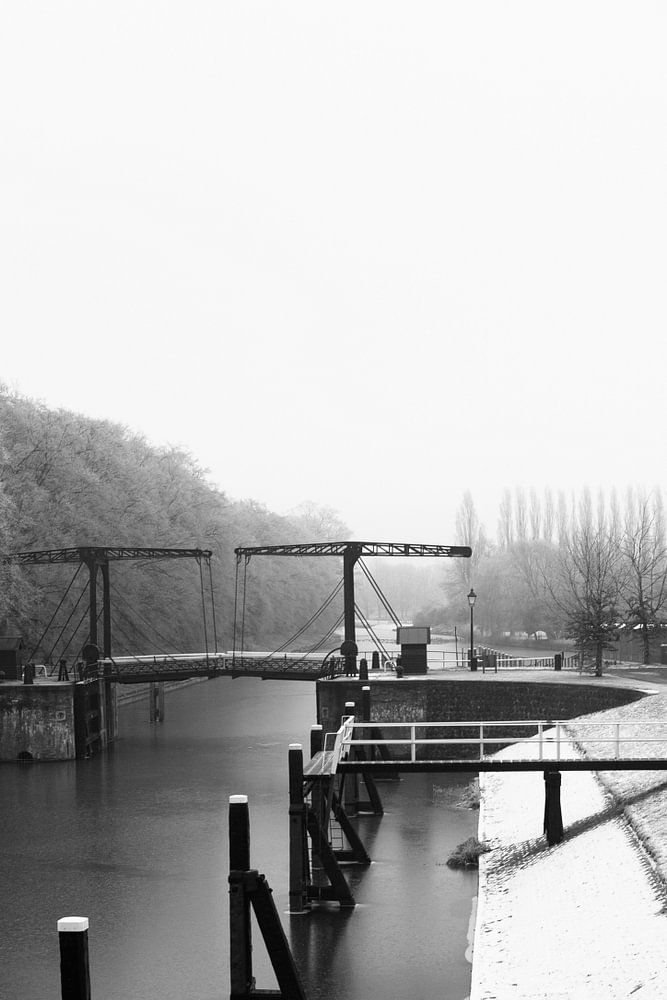 Een zwart wit foto van de Katerveersluis bij Zwolle in winterse sferen.