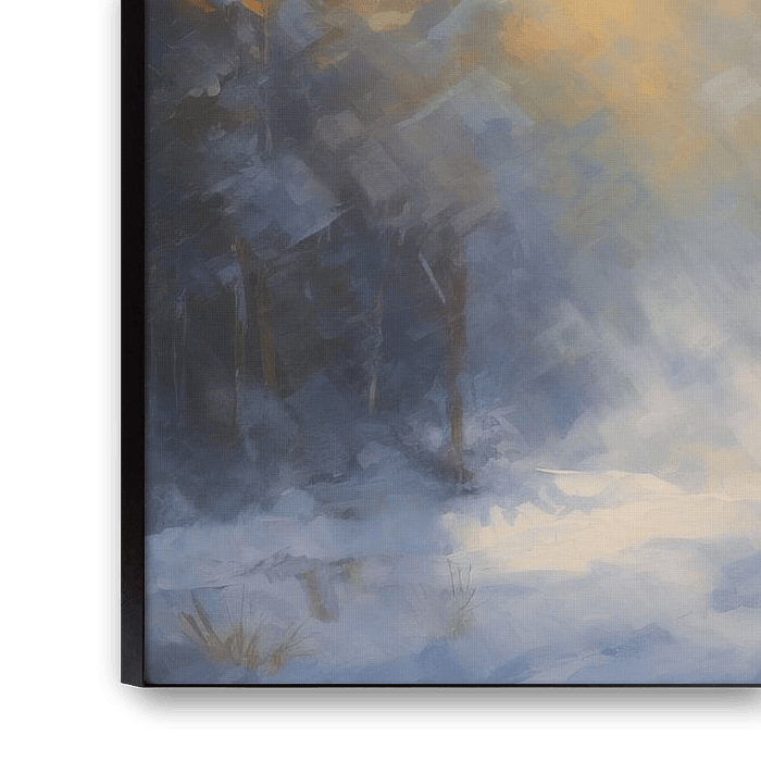 This work from the Faded Dreams series depicts a cosy wooden cottage in a snowy forest. The colour palette is composed of different shades of generous yellow, orange and blue. The work gives a modern look to your interior!