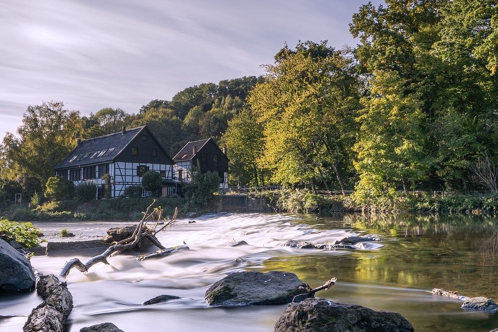 The historic Wipperkotten grinding mill on the Wupper in the evening light, landmark of the Bergisches Land, Solingen, Germany