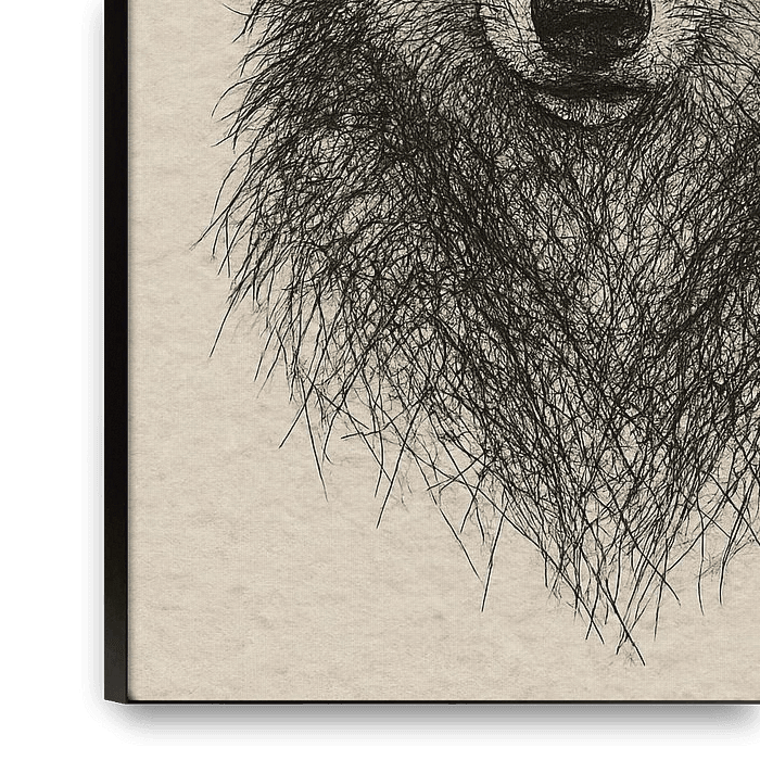 This intense portrait shows a wolf looking straight at you. Calm, but unmistakably alert. The portrait is composed of many loose black threads, which give the work a playful character. Together, they create a lively image full of texture and movement. It is remarkable how the dense lines make the fur almost tangible, while the…