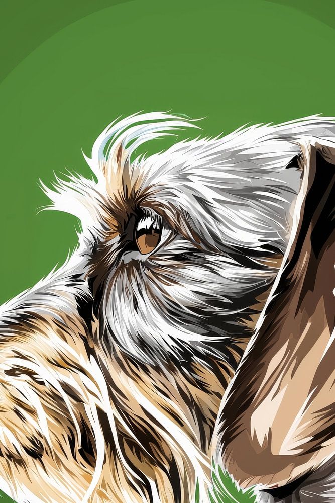 In this portrait, the wirehaired dachshund is depicted calm and alert against a deep green background. The colour green reinforces the natural character of this hunting dog and refers to the outdoors, nature and the instinct so strongly associated with the dachshund. The fine, rough coat has been carefully worked out, showing how…