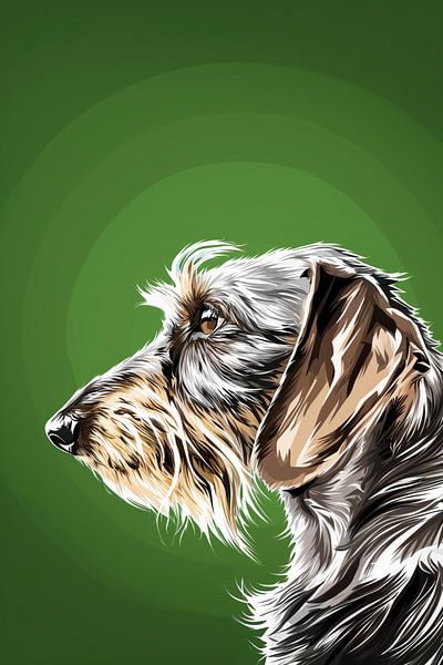 Buy this portrait Wirehaired Dachshund on Green Background by Lauren Wilde on canvas, ArtFrame, poster and wallpaper, printed on demand in high quality.