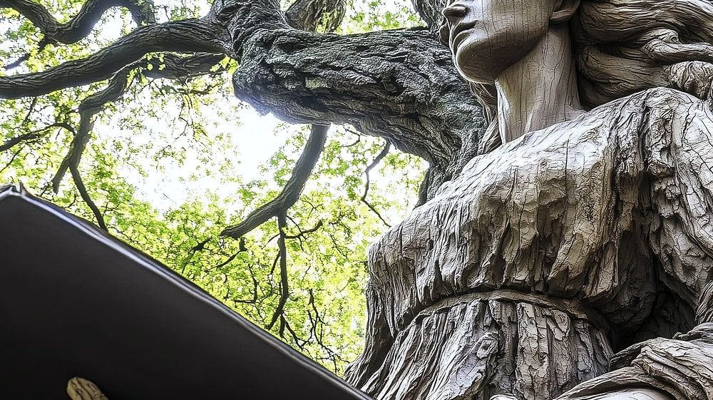 A wooden statue of a woman holding and reading a book stands next to a large tree with green leaves. It symbolises the interplay between the art of storytelling, nature and wisdom.
