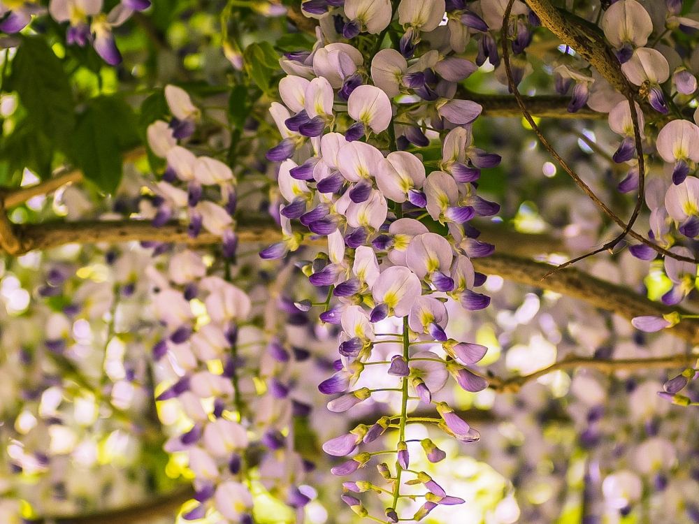 the branches are woven around the fence of the Wisteria, beautiful how full it is with flowers.