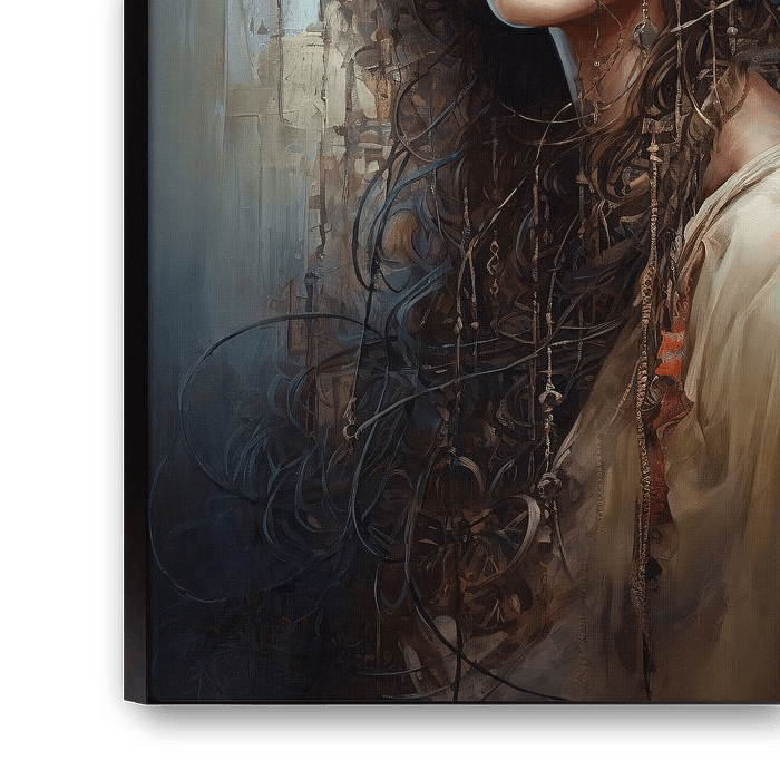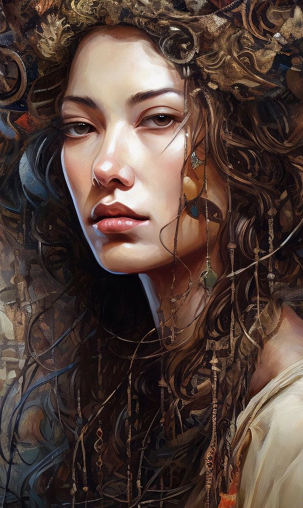 Portrait of a woman in Bohemian style. Mixed media in earth tones.