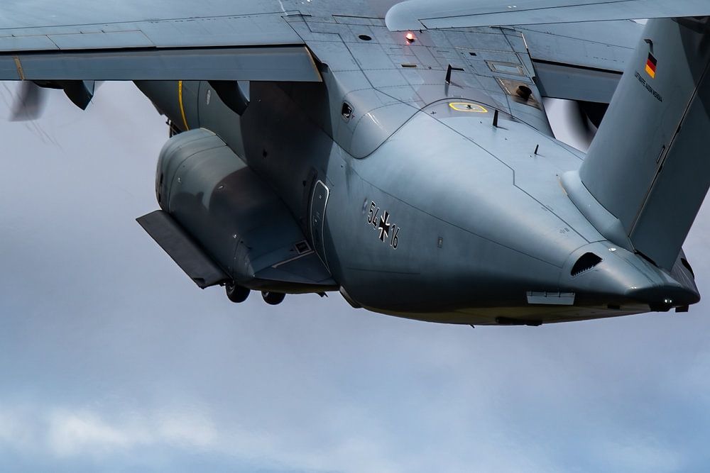 An Airbus 400M of the German Air Force takes off from the runway during the Royal International Air Tattoo 2023 at Fairford in the UK.