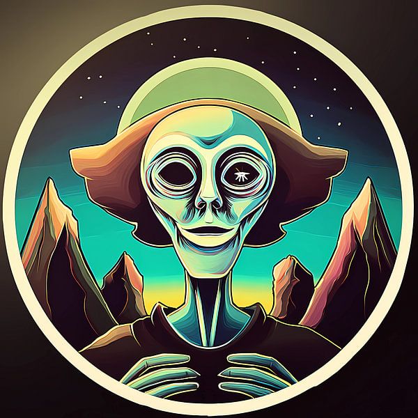 Framed like a celestial medallion, this figure gazes outwards with eyes that seem to contain entire star systems. The multi-layered halos are reminiscent of ancient iconography, while the alien countenance and distant mountains anchor the work in a liminal space between worlds. One eye bears a unique spark - symbolising consciousness,…