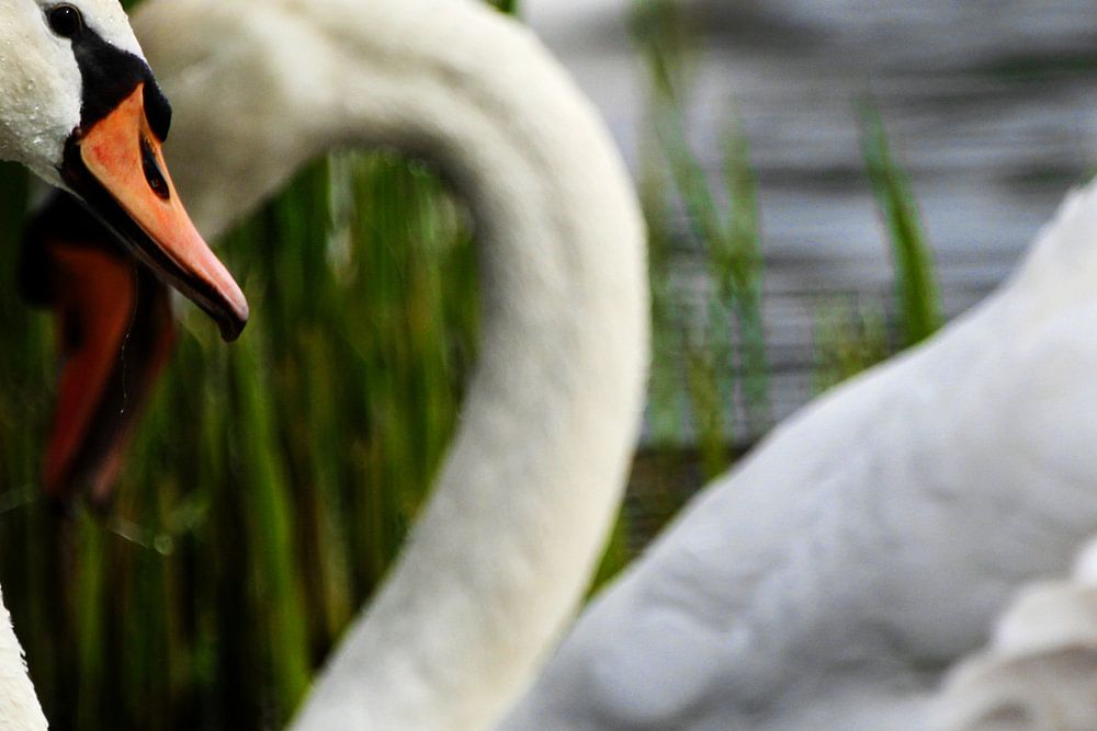 Een groep witte knobbelzwanen foerageerd tussen het riet. De twee zwanen die het meest duidelijk in beeld zijn vormen met hun halzen een hart. Niet zoals we het gewend zijn, maar wat natuurlijker en speels.