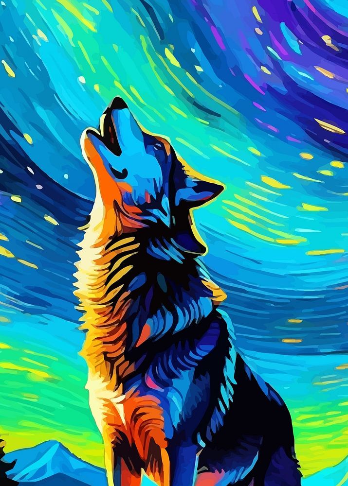 A wolf stands atop a hill, howling at the sky, its silhouette framed by the swirling, vibrant blues and yellows of a *Starry Night*-inspired sky. The night is alive with swirling patterns of stars and cosmic energy, echoing the wolf’s powerful stance and call. The undulating brushstrokes of the sky seem to mirror the wild spirit of the wolf, blending the natural world with the dynamic, expressive movement of the stars above.
