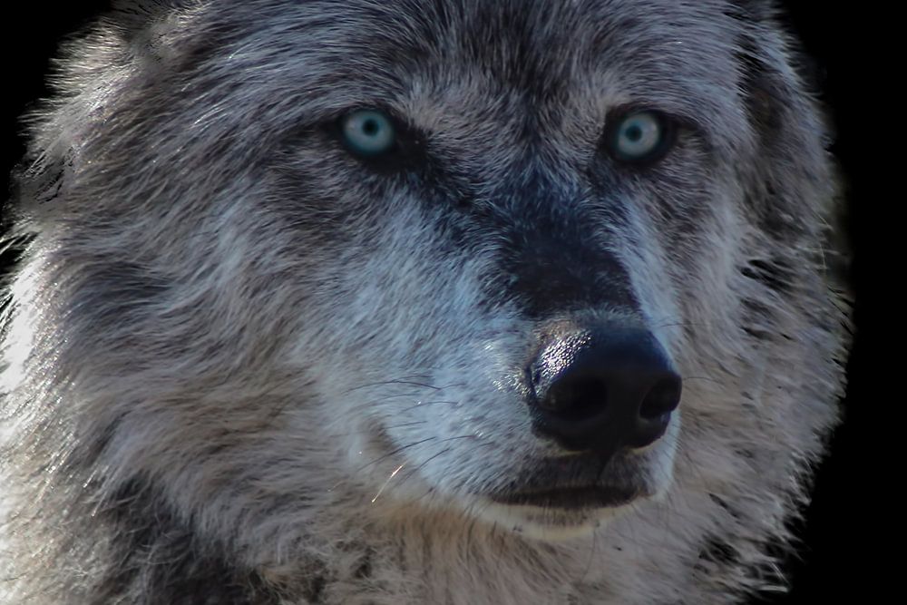 This is a portrait of a Rocky Mountains Wolf, taken in Yellowstone Park, USA.  The colour of the eyes has been adjusted by the photographer using a filter. The original photo is also on this page by Gert Hilbink.