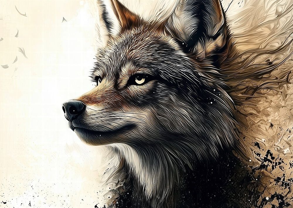 Out of the mists of darkness he appears, a wolf with a gaze that radiates ancient wisdom and indomitable power. His fur is a mixture of silver, grey and deep brown, a reflection of the wild earth he rules over. Every hair on his body seems to move with the wind, as if nature is embracing him and guiding him along his path.