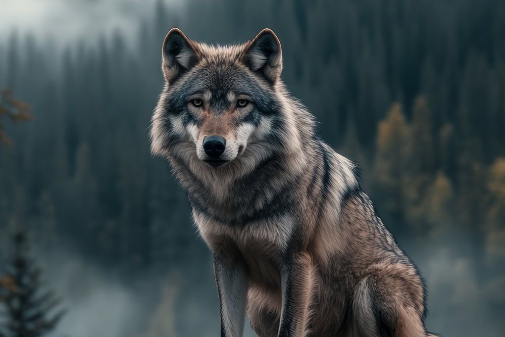 A wolf rests on a large boulder, acting as a natural vantage point in a vast Canadian landscape. Surrounded by tall pine trees and a light mist, the wolf seems at one with the nature around him. The trees rise from the mist, creating a mystical atmosphere. The wolf looks around intently, as if taking in the surroundings. The rugged landscape emphasises the wild beauty of Canada, where nature and animals live together in harmony. This image captures a quiet moment in a vast, untouched wilderness.