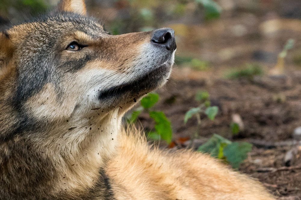 Liggende wolf in het bos met zijn neus omhoog gericht om te ruiken