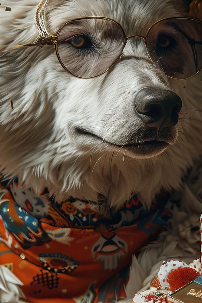 A wolf in party clothes with a birthday hat and a cake is visibly enjoying himself in the studio.