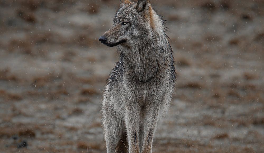 The wolf during a hard rainstorm somewhere in the middle of the Veluwe .