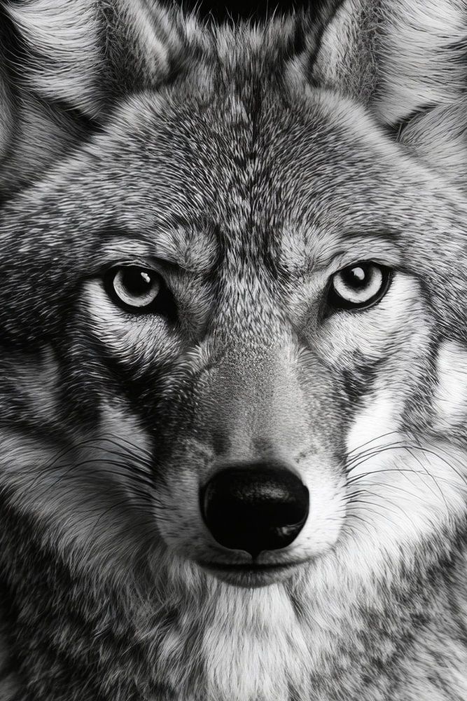 A mesmerising portrait of a majestic wolf whose piercing gaze and fine fur details shine in powerful black and white. The intelligence and ferocity of this animal captures the viewer, while the sharp contours provide a dramatic accent. Ideal for the living room, it creates a connection to nature and is thought-provoking.