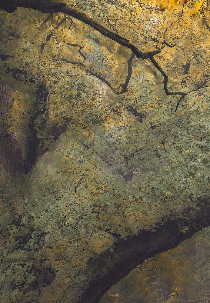 Multiple exposure of a large old tree. Three photos were merged in-camera, two of which were deliberately moved. The colours have been edited into autumn tones.