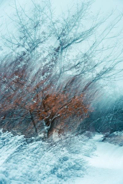 ICM or 'intentional camera movement' of a winter landscape at Wolfhezerheide in Doorwerth, in the Veluwe in Gelderland. It is snowing and everything is white. Movement with the camera creates an artistic effect.
