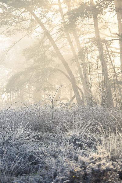 A landscape on the Wolfhezerheide in Doorwerth, in the Veluwe region of Gelderland. It is a cold, misty morning in March. The sun is rising, creating a lovely atmosphere.