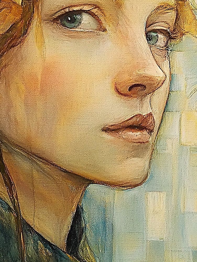 Details: woman, flowers, gold, yellow, green, wreath, realistic, serenity, portrait, gaze
