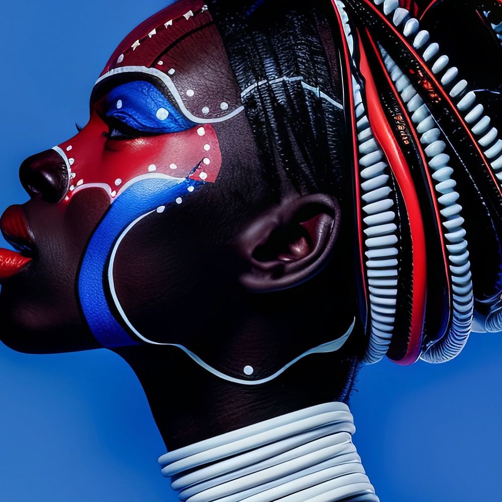 This artistic portrait captures the harmonious combination of intense colour accents and deep black skin. The vibrant red and blue tones set powerful accents and create an exciting contrast. The abstract shapes and lines create a visual depth that captivates the viewer. Ideal for art lovers and collectors of modern portraits who are…