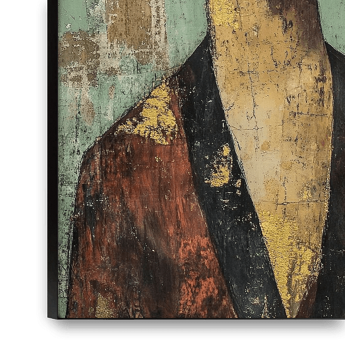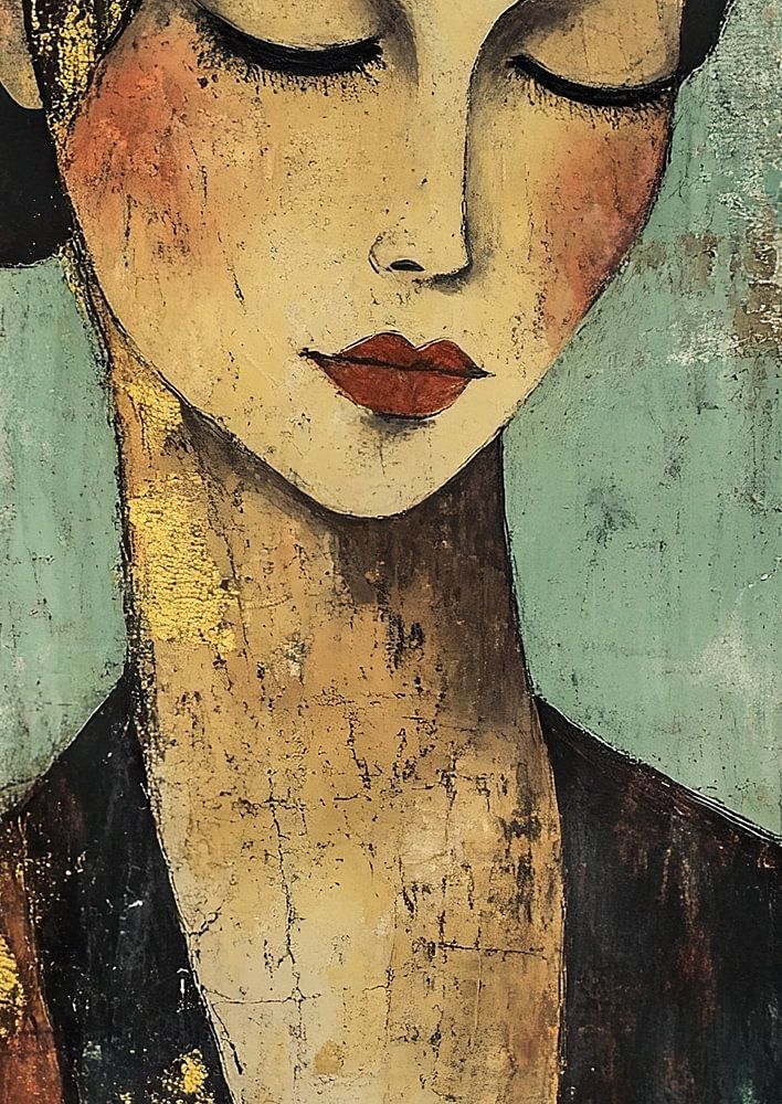 Woman Gold | Woman with Closed Eyes Gold - This is a woman painting of a serene woman with closed eyes and long neck, painted in a modern figurative style with subdued beige and earth tones and striking gold accents, this woman painting, painting woman and women painting emphasises tranquillity, texture and subtle gold…