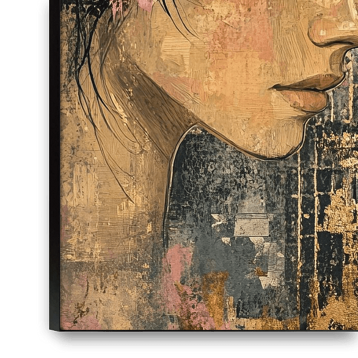 Woman Gold - This is a women painting of a side view of a woman with flowers in her hair, a modern abstract portrait with subdued beige and gold tones, soft pink flower accents and visible paint texture; painting woman, women painting.
