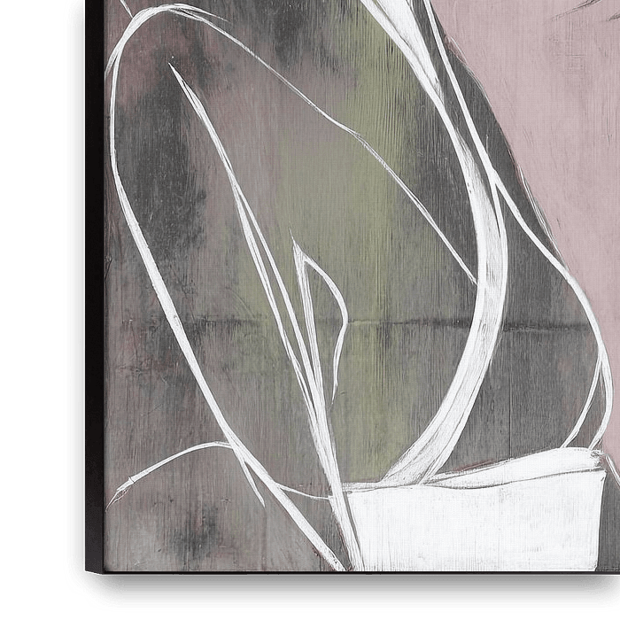 De achtergrond is een geruststellende, dof-rosige wash die het geheel omhult en tegelijkertijd afstand creëert. Die roze achtergrond geeft contrast maar stoort niet: het is als een zachte muur achter iemand die nadenkt. Omdat de verf dun is opgebouwd, ademen de kleuren; het oppervlakte oogt enigszins mat met her en der glanzende vlekjes — een tactiele afwisseling die je bijna kunt voelen aan je vingertoppen. Dit is een kimono schilderij én een profiel schilderij dat speelt met aanwezigheid en vervaging: contouren zijn hier net zo belangrijk als leegte.