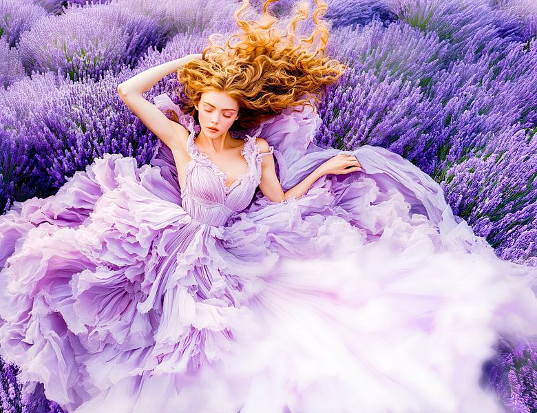 A dreamy portrait of a woman in a flowing lavender couture dress lying in a blooming field. A romantic scene full of elegance, softness and timeless beauty.