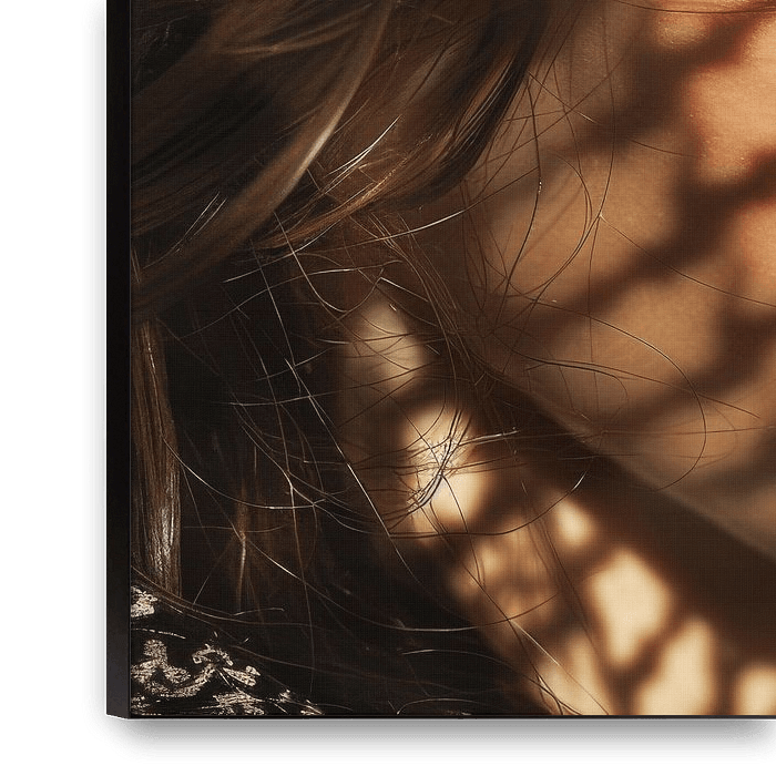 This mesmerising portrait shows a woman whose face is covered in a complex pattern of light and shadow. The warm rays of sunlight emphasise the soft facial features and create a play of contrasts that enhances the natural beauty and depth of expression. Ideal for lovers of portraits and decorative art, this work brings a unique and…