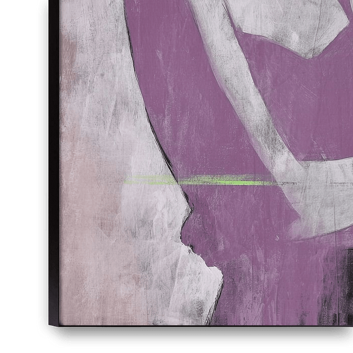 Vrouw Silhouet - Dit is een vrouw schilderij dat je meteen naar de binnenkant van een moment voert. De afbeelding toont één enkele, grote silhouet — een vrouw met naar voren gebogen hoofd en opgeheven armen in een gesloten houding — uitgebeeld als een vlakke, paars ingevulde figuur tegen een zacht, geschuurd achtergrond. De keuze om de…