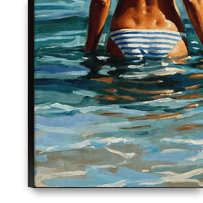 This painting captures a serene moment of connection between humanity and nature, seen through the artist's impressionistic lens. The central figure, a woman standing waist-deep in shimmering turquoise water, embodies tranquility and introspection. Her back is turned, inviting the viewer to share her perspective as she gazes toward the…