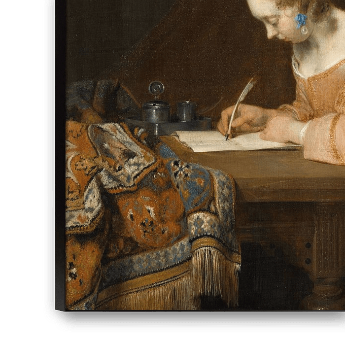 Woman Writing a Letter, Gerard ter Borch. Ter Borch’s oeuvre consists largely of intimate paintings of people absorbed in what they are doing. This woman writing a letter is the first of a whole series and was an example for other artists, like Vermeer.