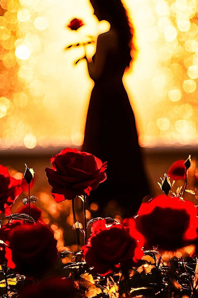 This beautiful image shows a woman in silhouette enjoying a rose, surrounded by a sea of vibrant red flowers. The warm golden glow of the background creates a magical atmosphere, making the whole picture reminiscent of a romantic sunset. Perfect as a wall decoration to bring an intimate and elegant atmosphere to any room. Ideal for lovers of nature, beauty and timeless style.